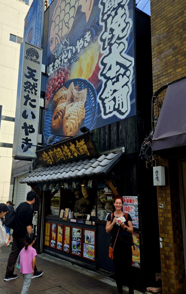 Während eines Parkwechsels hat Martina endlich ihr erstes Taiyaki in Tokyo bekommen. Ein zB mit Anko oder Puddingcreme gefülltes Gebäck in Form eines Fisches, das man auch schon mal unterwegs essen darf, was in Japan eigentlich nicht gern gesehen ist. Daheim machen wir sie immer mit Nutella und Bananen, aber das findet man hier natürlich nicht. 😉